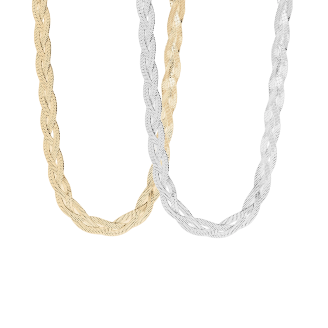 The Brielle Necklace is a modern take on a classic braided herringbone design. With its fluid silhouette and bold texture, this 17-inch piece adds timeless sophistication to any neckline. Available in two finishes—polished stainless steel or 18k PVD-coated gold—it’s crafted for durability, comfort, and everyday elegance. Effortlessly chic on its own or layered with your favorite chains, Brielle is a staple you'll reach for again and again.