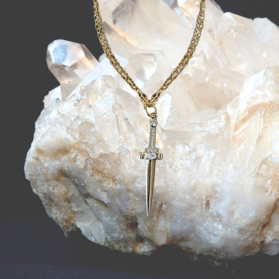 Bold yet elegant, the Dani Necklace is a statement piece with a sharp edge. Featuring a sleek dagger-style pendant adorned with a sparkling trio of CZ stones, Dani symbolizes strength, protection, and a little rebellion. Suspended on a delicate gold chain, it layers beautifully or stands strong on its own.