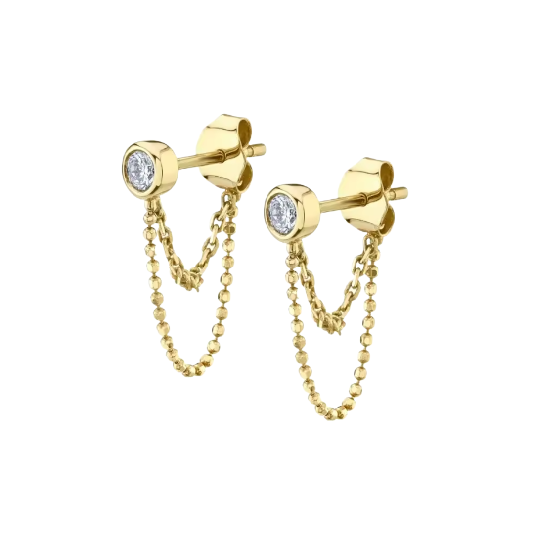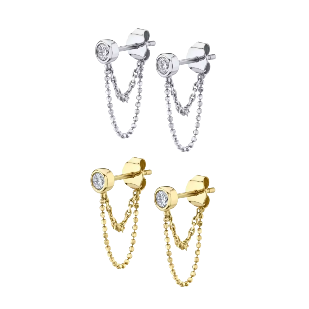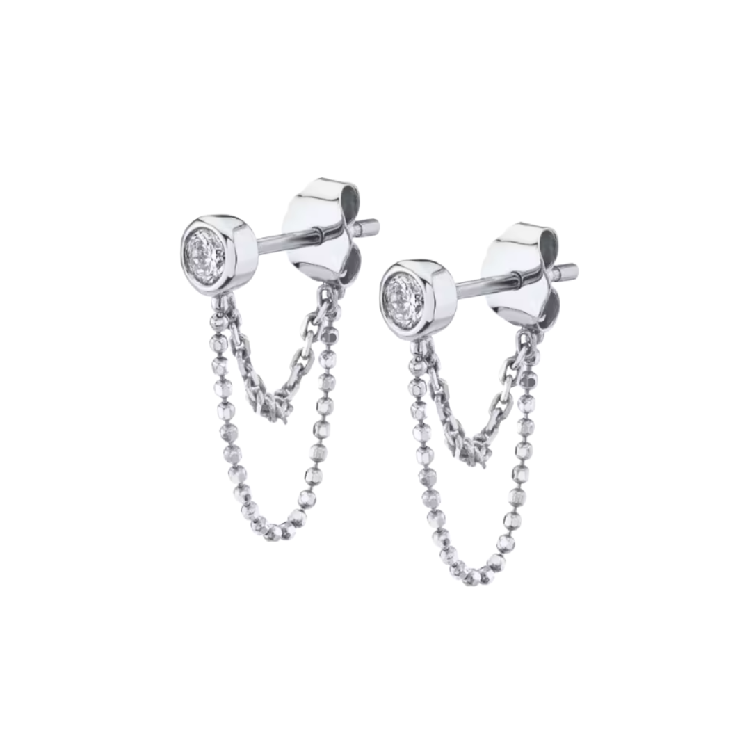 Minimal with a little edge, the Saylor Earrings are all about quiet statement energy. A sleek bezel-set stud anchors a delicate double drape of bead and chain, creating soft movement and just enough shine. Understated but interesting, they’re the kind of earrings that elevate a simple tee, layer effortlessly with other piercings, and still feel polished enough for a night out.